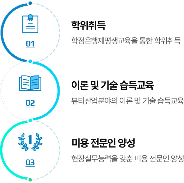 교육과학기술부에서 인증한 2006년 전공단위 이학사 피부미용학 전공승인 학위과정을 시작으로 현장의 실무를 경험함과 동시에 학위를 취득하여, 다변화 되고 있는 뷰티산업 분야의 세계적인 흐름을 주도할 수 있는 명실상부한 전문 미용인 양성을 목표로 하는 전공입니다.