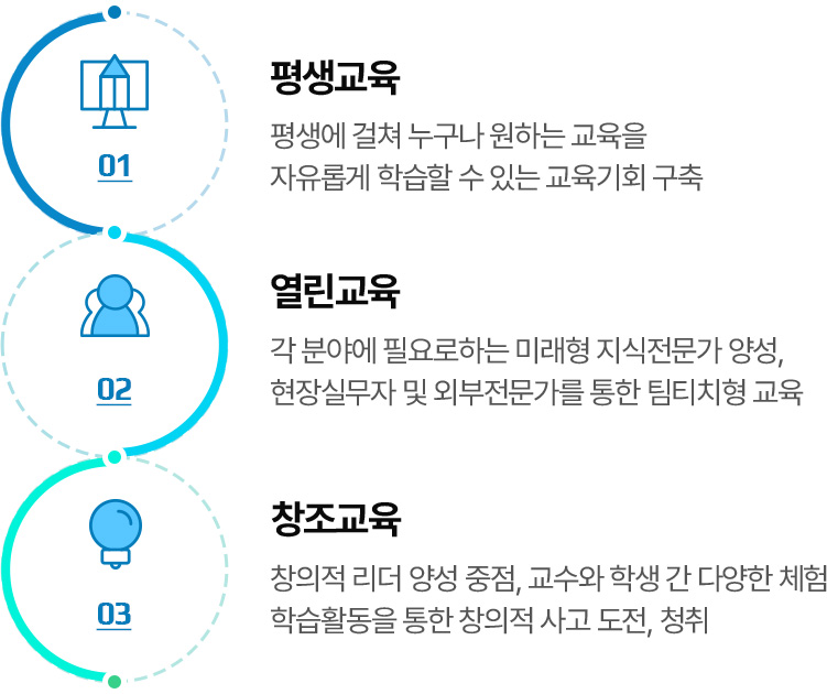 교육의 기회는 나이, 직업, 환경과 관계없이 누구나 공평한 기회를 제공받을 수 있어야 한다는 주1일과정의 설립취지에 따라 개인의 상황과 적성, 성향을 고려한 1:1 맞춤형 학습설계를 제공하여 최단기간에 학위를 취득하고 명문대학원에 진학할 수 있는 교육과정입니다.